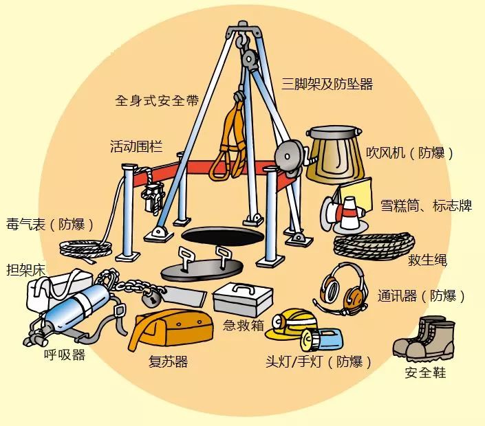 應急計劃 應根據(jù)受限空間作業(yè)的特點,制定應急方案。應急方案包括:風險分析、預防預警、應急響應、緊急處置、救援方式、現(xiàn)場監(jiān)測、后期處置。并開展應急演練,記錄存檔。一般使用的應急器具包括有: