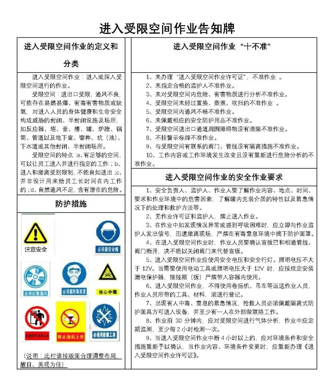 進入有限空間必須嚴格落實以下要求 注意事項: 1.必須嚴格實行作業(yè)審批制度,嚴禁擅自進入有限空間作業(yè)。 2.必須做到“先通風、再檢測、后作業(yè)”,嚴禁通風、檢測不合格作業(yè)。 3.必須配備個人防中毒窒息等防護裝備,設(shè)置安全警示標識,嚴禁無防護監(jiān)護措施作業(yè)。 4.必須對作業(yè)人員進行安全培訓,嚴禁教育培訓不合格上崗作業(yè)。 5.必須制定應急措施,現(xiàn)場配備應急裝備,嚴禁盲目施救。